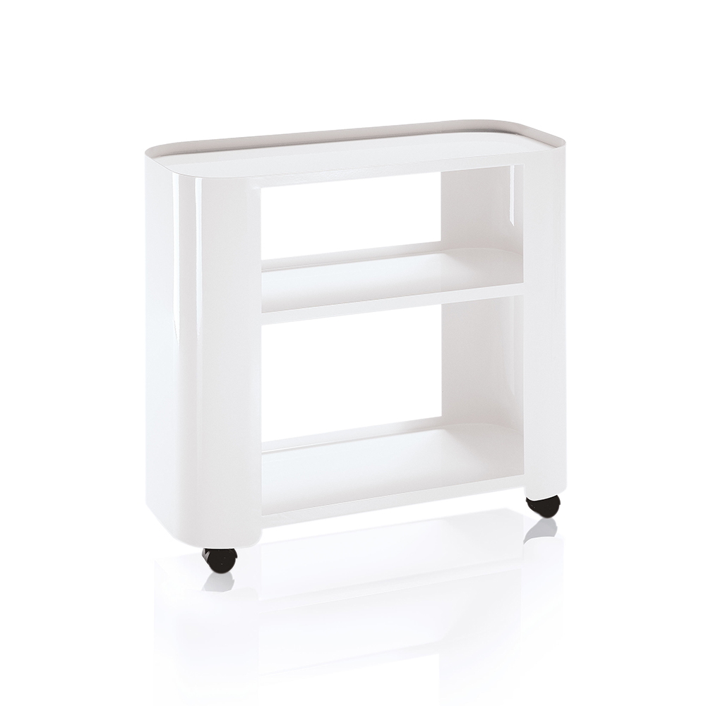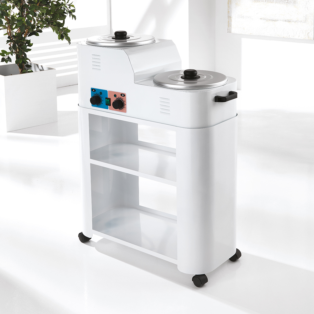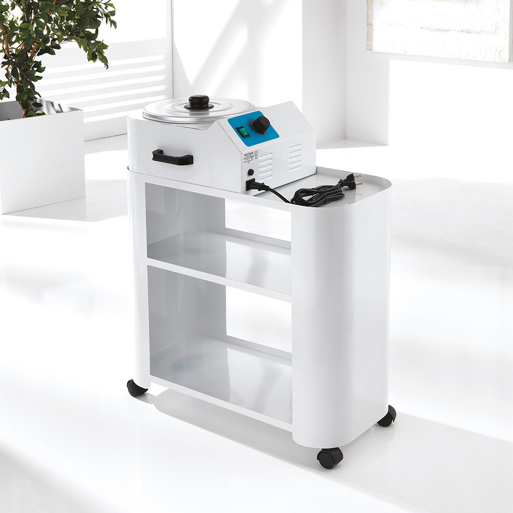 Három polcos eszközkocsi szőrtelenítéshez, fehér színben. Masszív fém szerkezettel rendelkezik, hogy a gyantázáshoz szükséges eszközöket elbírja. A polcok kerete megakadályozza a termékek leesését. A görgőknek köszönhetően könnyen mozgatható.