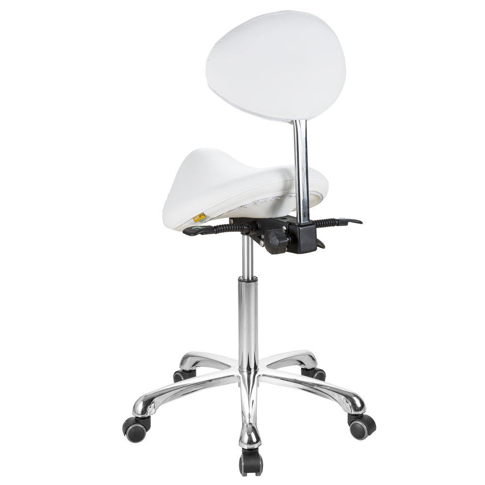 Az AE301025-ös gurulós forgózsámoly igazi élménnyé varázsolja a mindennapos munkát. Közkedvelt nyeregzsámolyunk továbbfejlesztett, háttámlával szerelt változata szinte mindent tud, amire egy kozmetikai szalonnak, vagy orvosi rendelőnek a kényelmes munkavégzéséhez szükséges. Nyereg formájú ülőrésze a hosszabb, munkával töltött napok során tehermentesíti a gerinc melletti tartóizmokat. Természetes és kényelmes üléspozíciót biztosít. Hidraulikusan állítható magassága, ülési szöge és háttámlája pedig testalkattól függetlenül segít megtalálni a legideálisabb ülőhelyzetet.