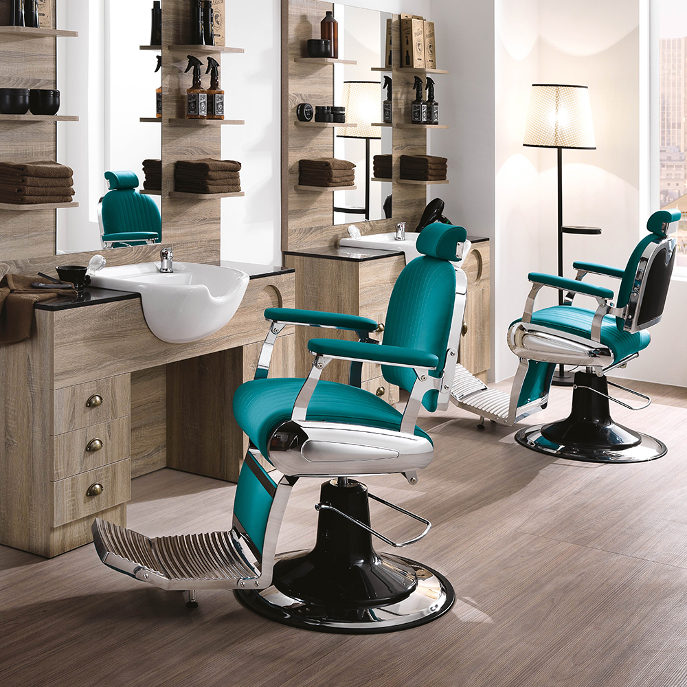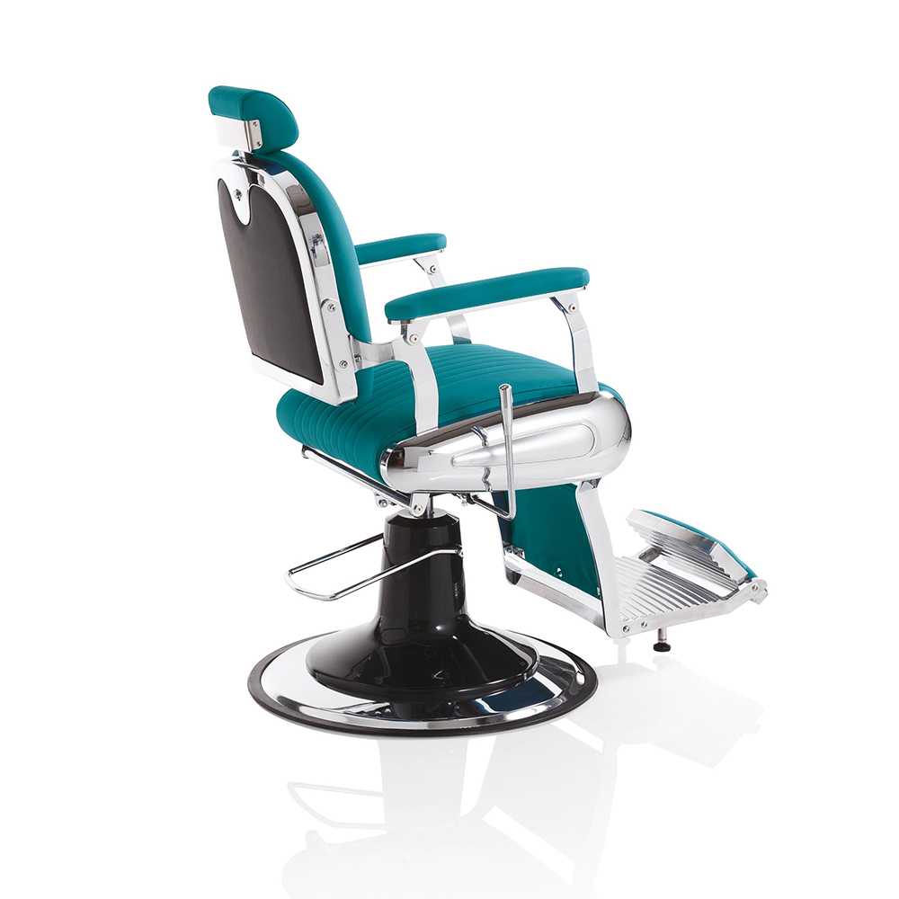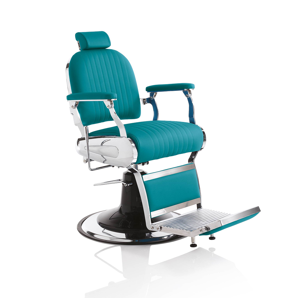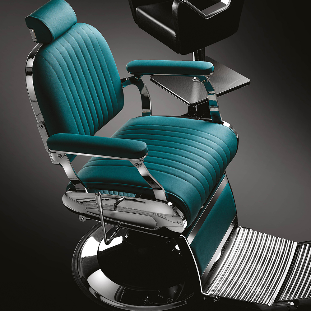 A Hair Cadillac elegáns és nagyszerű barber szék, dönthető háttámlával, kárpitozott lábtartóval és állítható fejtámlával, türkizkék műbőr borítással áll rendelkezésre. Türkizkék színével és krómozott elemeivel retro hangulatot idéz a barber szalonodba.