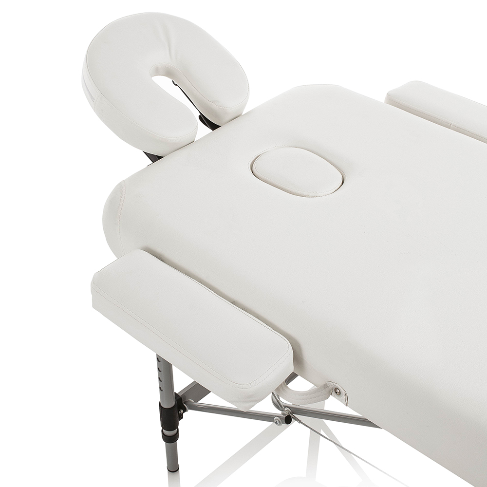Master Alluminium masszázságy fehér színben, masszív alumínium vázzal. Állítható lábakkal rendelkezik ez a masszázs ágy. Összecsukható kivitel, nagy teherbírással. Ultrakönnyű súly, a könnyű hordozhatóságért. A hordtáska és a karfák mind tartozékai ennek a masszázságynak.